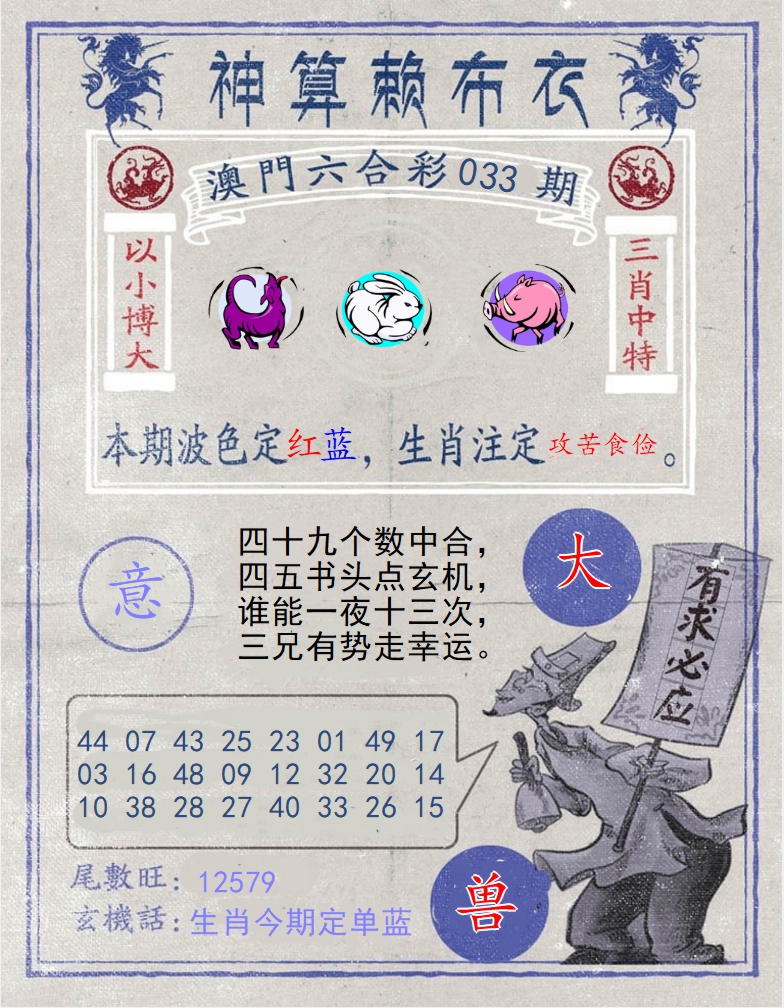 | 033期:四十九个数中合,四五书头点玄机,谁能一夜十三次,三兄有势走幸运 |